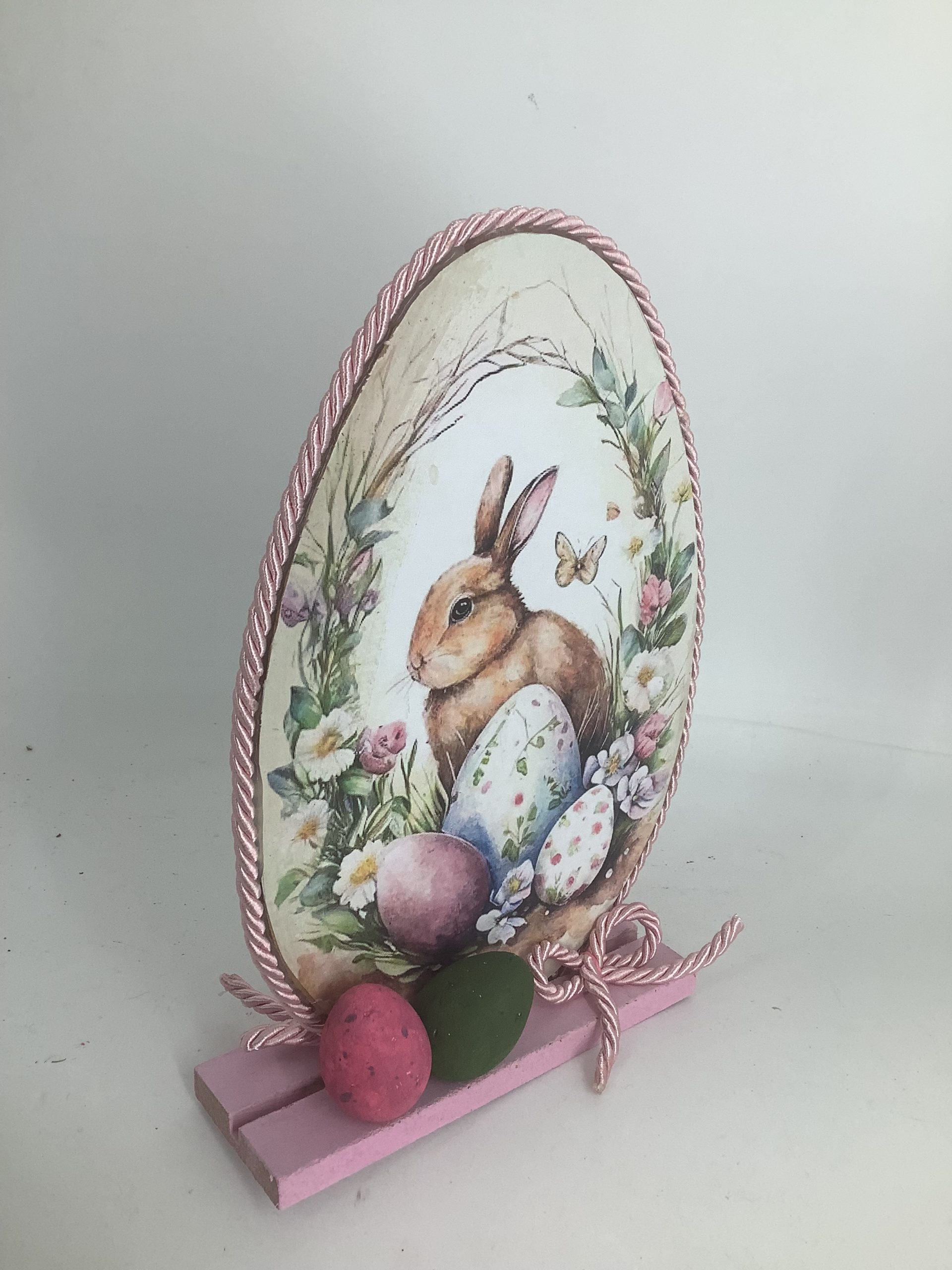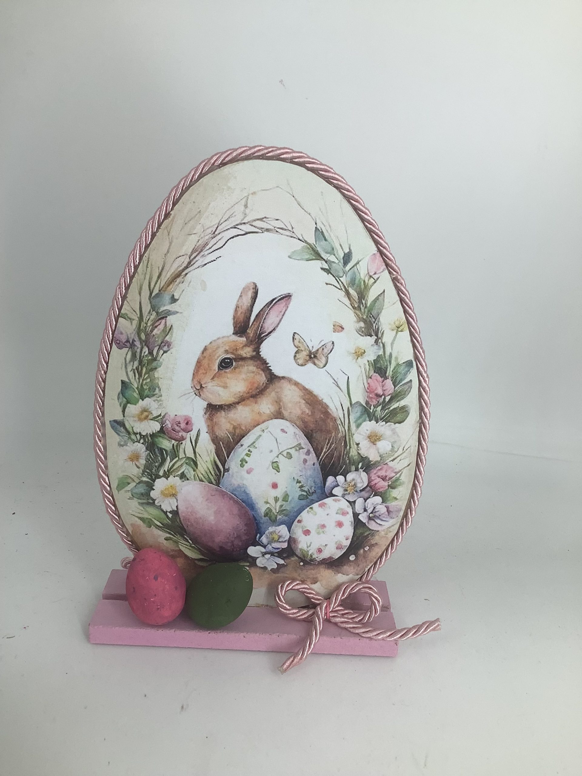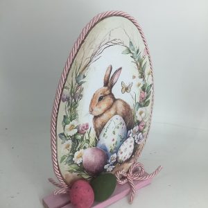 Πασχαλινό διακοσμητικό ξύλινο αυγό 20cm με λουλούδια και ένα χαριτωμένο λαγουδάκι σε αποχρώσεις του ροζ. Ένα εξαιρετικό χειροποίητο διακοσμητικό για τα κάνετε και εσείς ένα μοναδικό δώρο στους αγαπημένους σας.