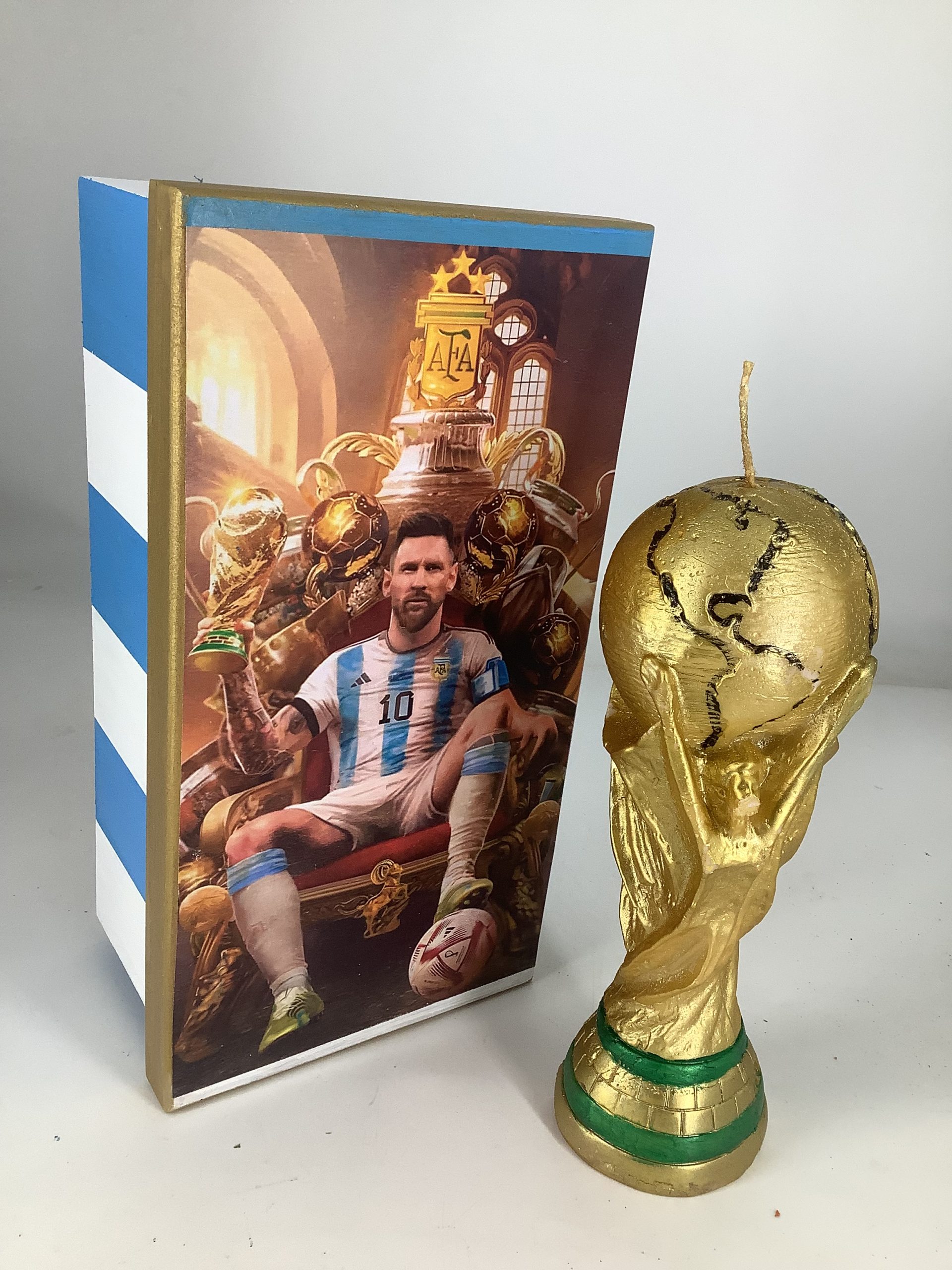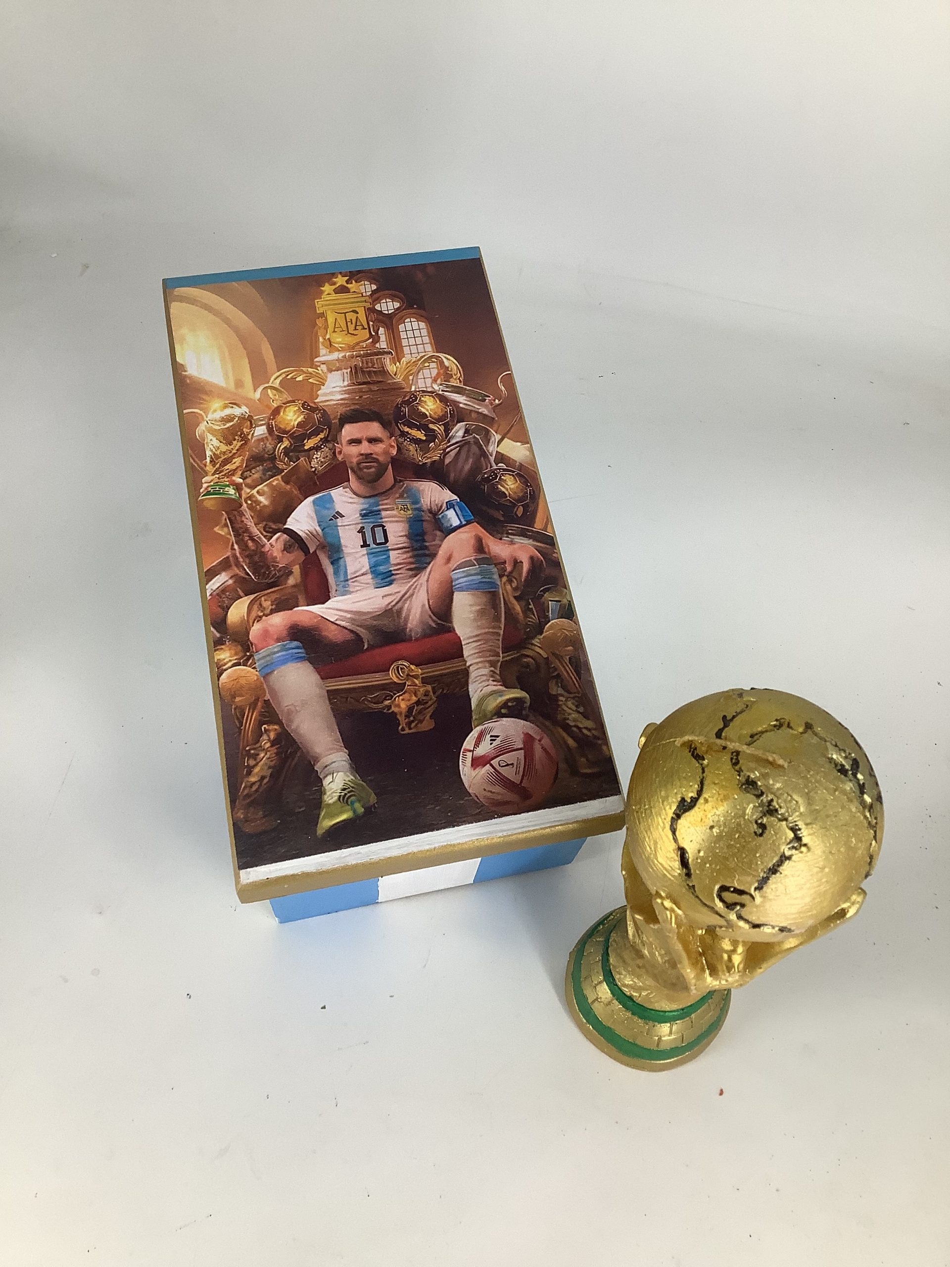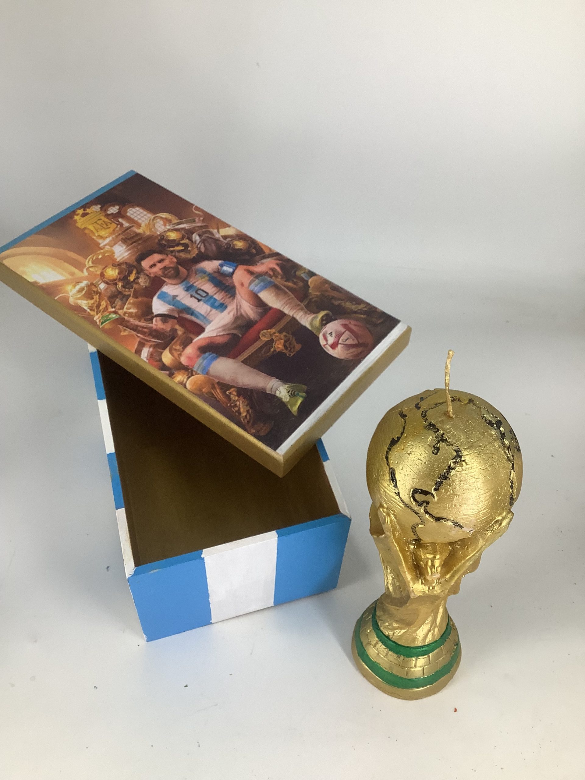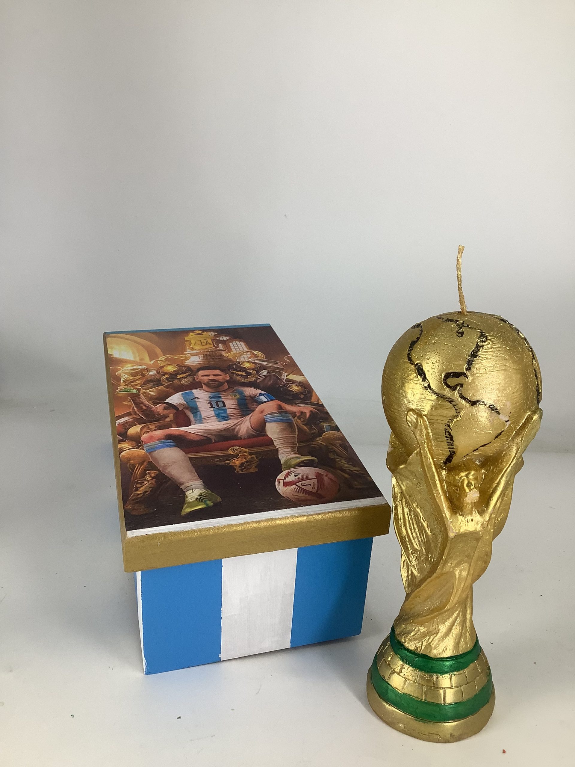 Χειροποίητο κουτί με τρόπαιο με τον αγαπημένο σας ποδοσφαιριστή Lionel Messi. Συνοδεύεται με 3D λαμπάδα τρόπαιο για να είναι και φέτος η λαμπάδα σας μοναδική.