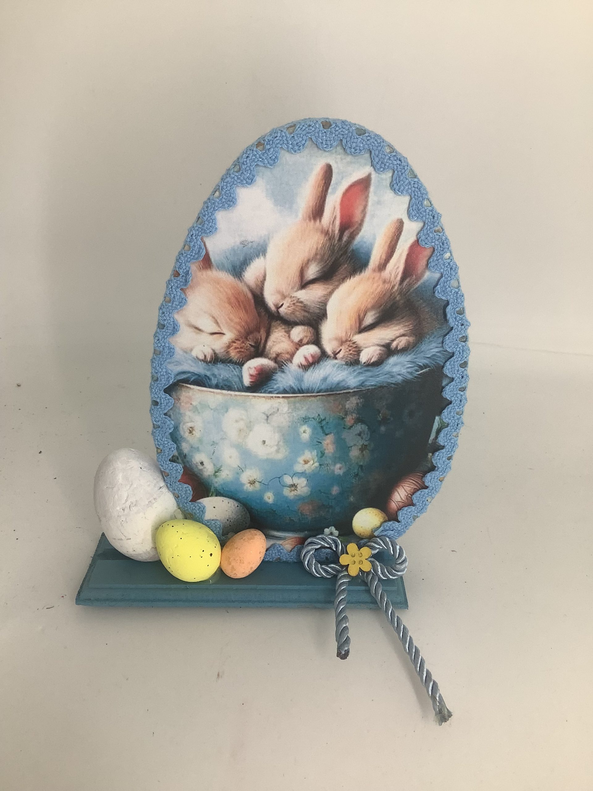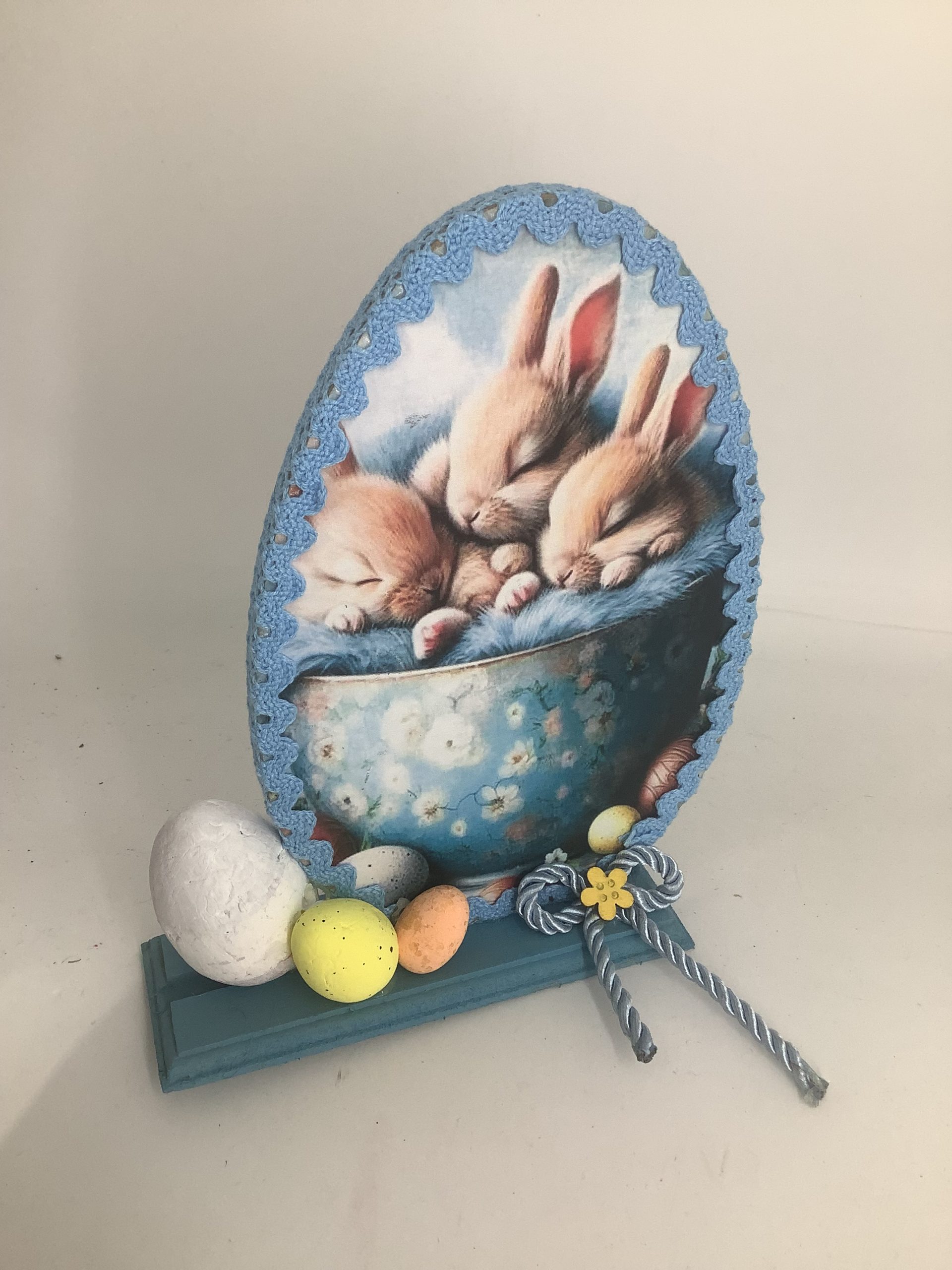 Πασχαλινό διακοσμητικό ξύλινο αυγό 20cm με λουλούδια και ένα χαριτωμένα λαγουδάκια σε αποχρώσεις του γαλάζιου. Ένα εξαιρετικό χειροποίητο διακοσμητικό για τα κάνετε και εσείς ένα μοναδικό δώρο στους αγαπημένους σας.