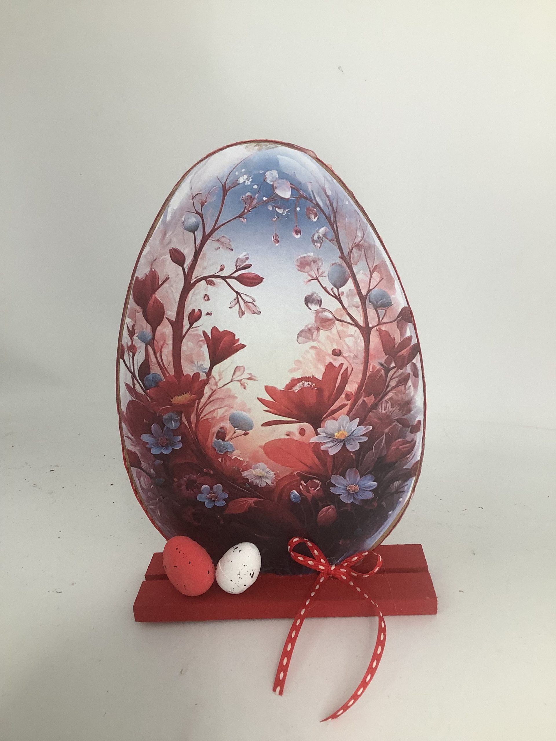 Πασχαλινό διακοσμητικό ξύλινο αυγό 20cm με λουλούδια σε αποχρώσεις του κόκκινου. Ένα εξαιρετικό χειροποίητο διακοσμητικό για τα κάνετε και εσείς ένα μοναδικό δώρο στους αγαπημένους σας.