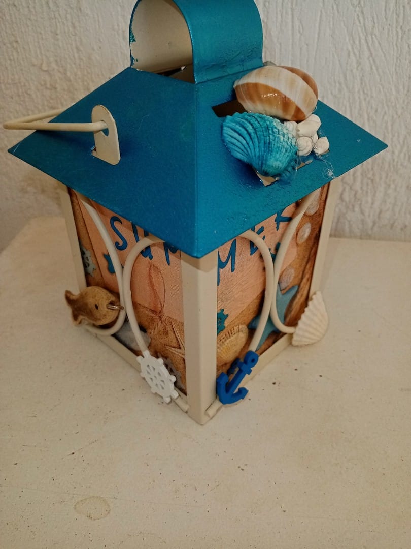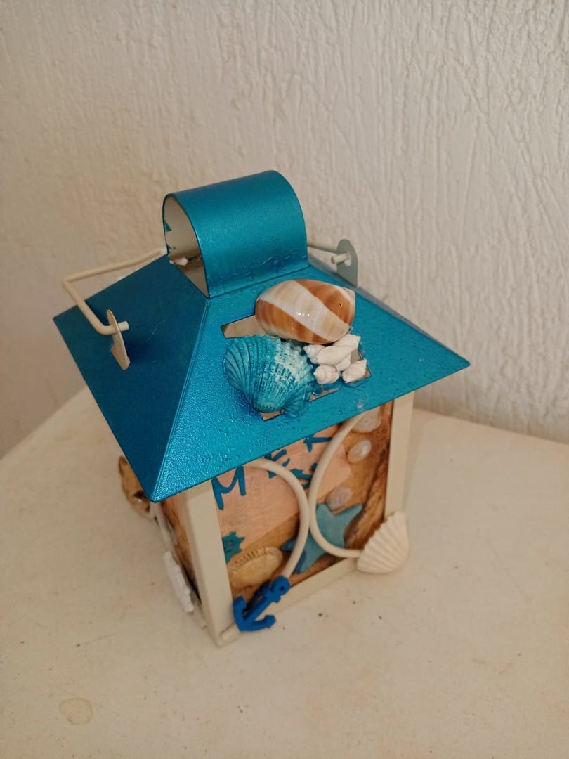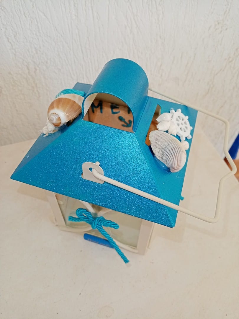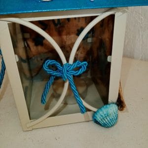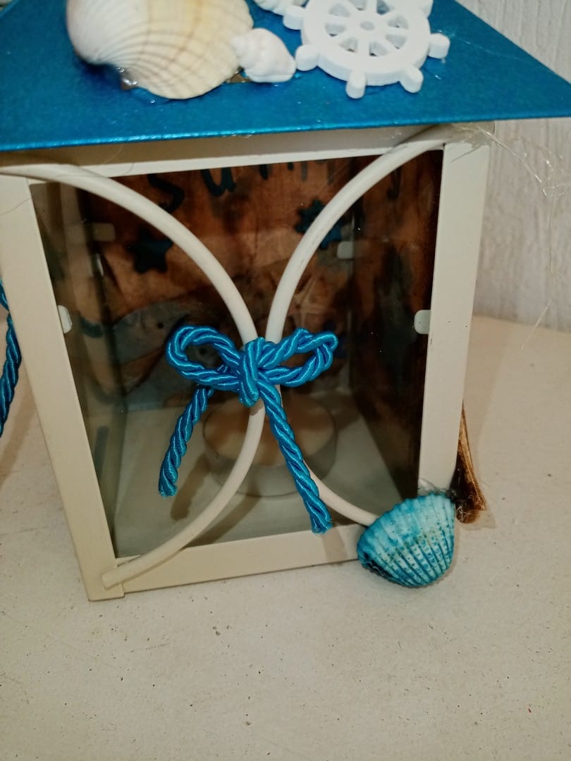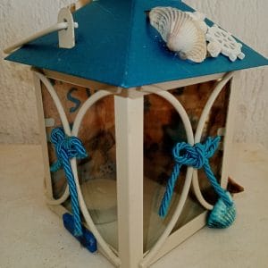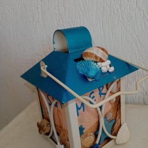 Μικρό φαναράκια θαλασσινό με θέμα στα 2 από τα τέσσερα τζάμια του, χρωματισμένο το πάνω μέρος διακοσμημένο με κοχύλια και ρεσώ στο εσωτερικό για να δώσετε μια διαφορετική ατμόσφαιρα.