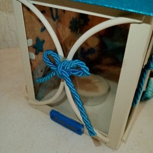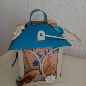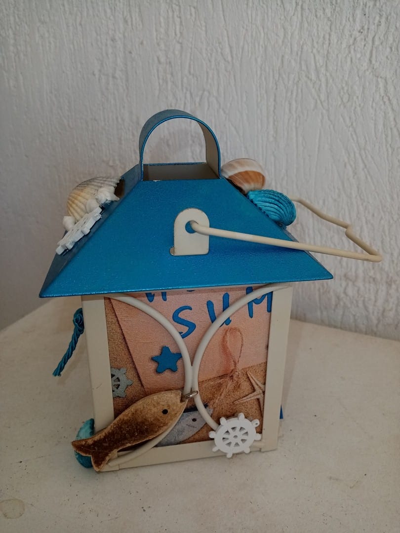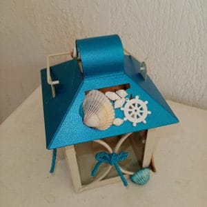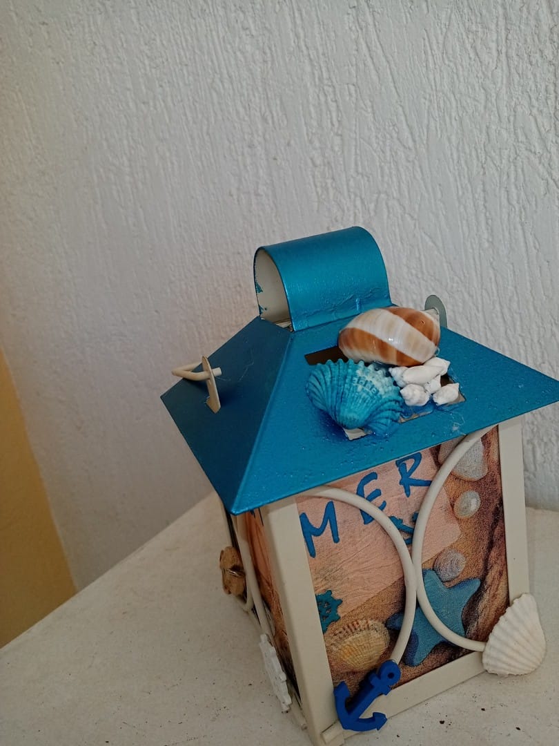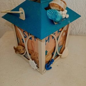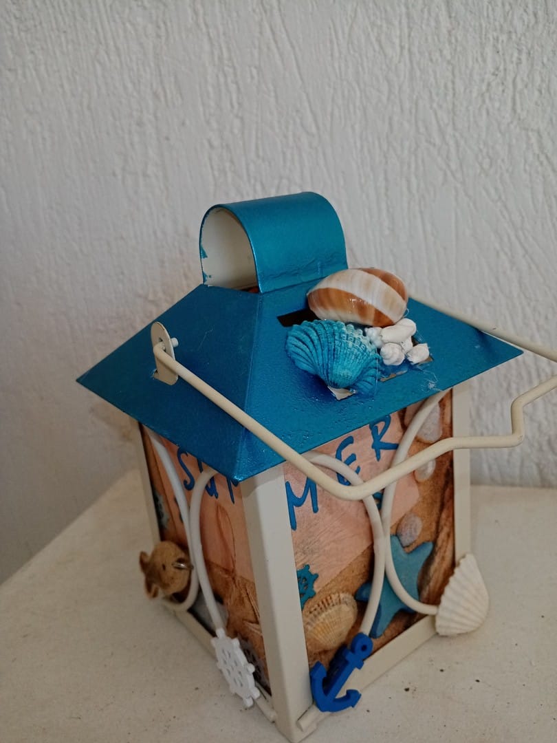Μικρό φαναράκια θαλασσινό με θέμα στα 2 από τα τέσσερα τζάμια του, χρωματισμένο το πάνω μέρος διακοσμημένο με κοχύλια και ρεσώ στο εσωτερικό για να δώσετε μια διαφορετική ατμόσφαιρα.