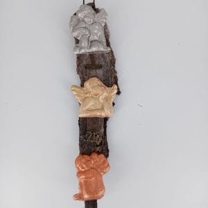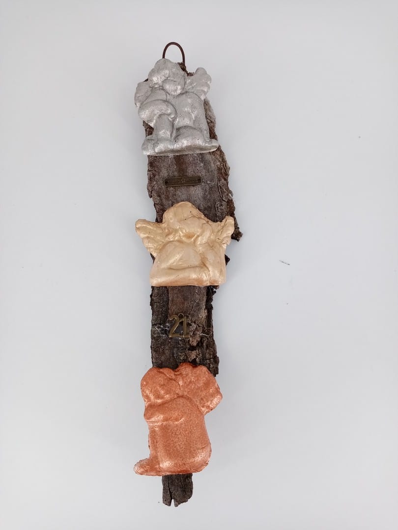 Γούρι σε φυσικό φλοιό δέντρου με κεραμικά αγγελάκια στα χρώματα χρυσό ασημένιο και μπρονζέ.