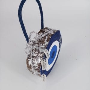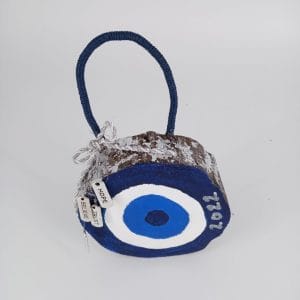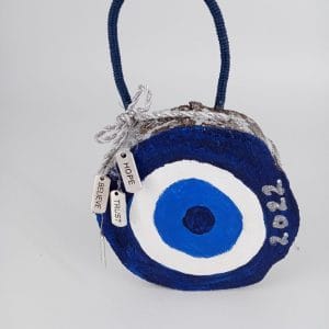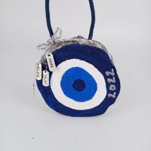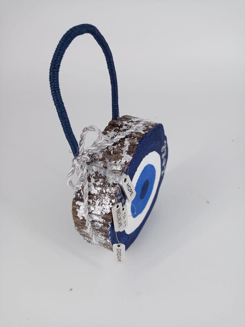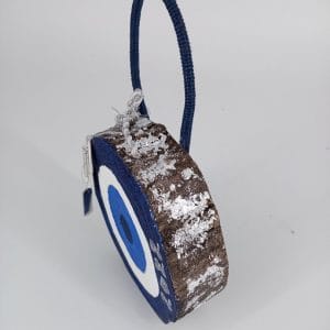 Γούρι ματάκι σε ξύλο ελιάς με μεταλλικές ταμπελίτσες με ευχές.