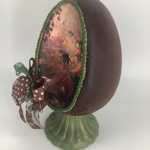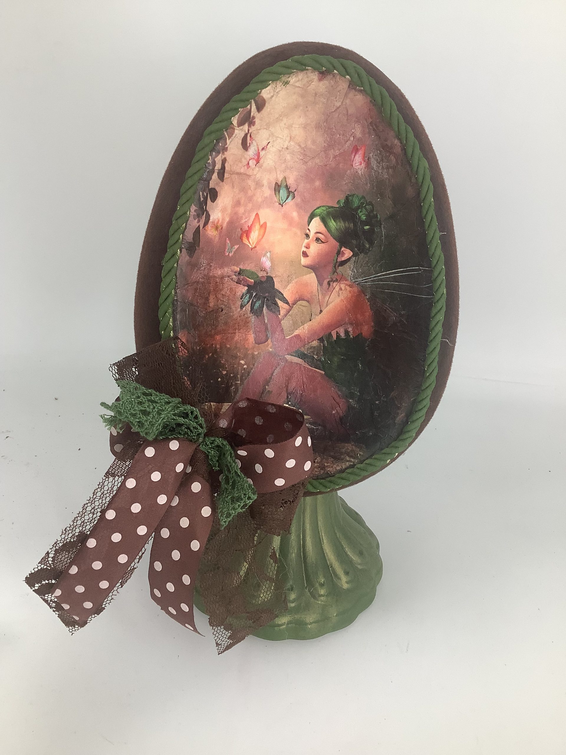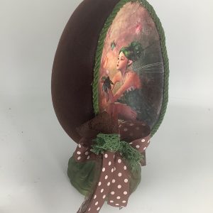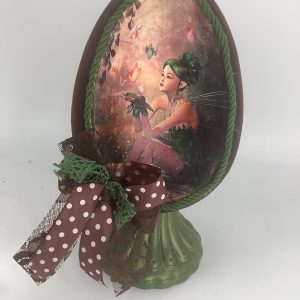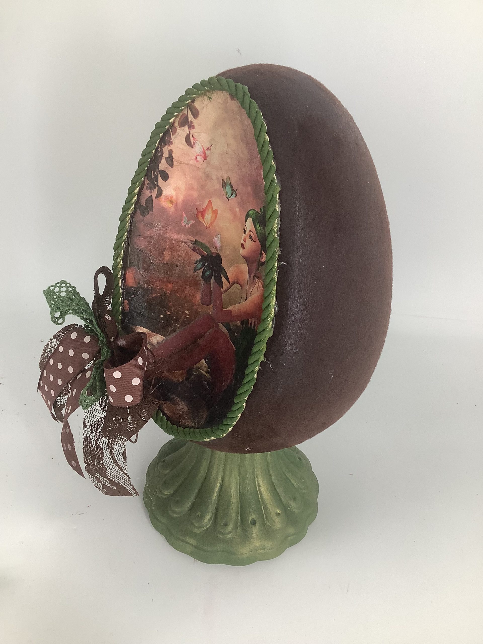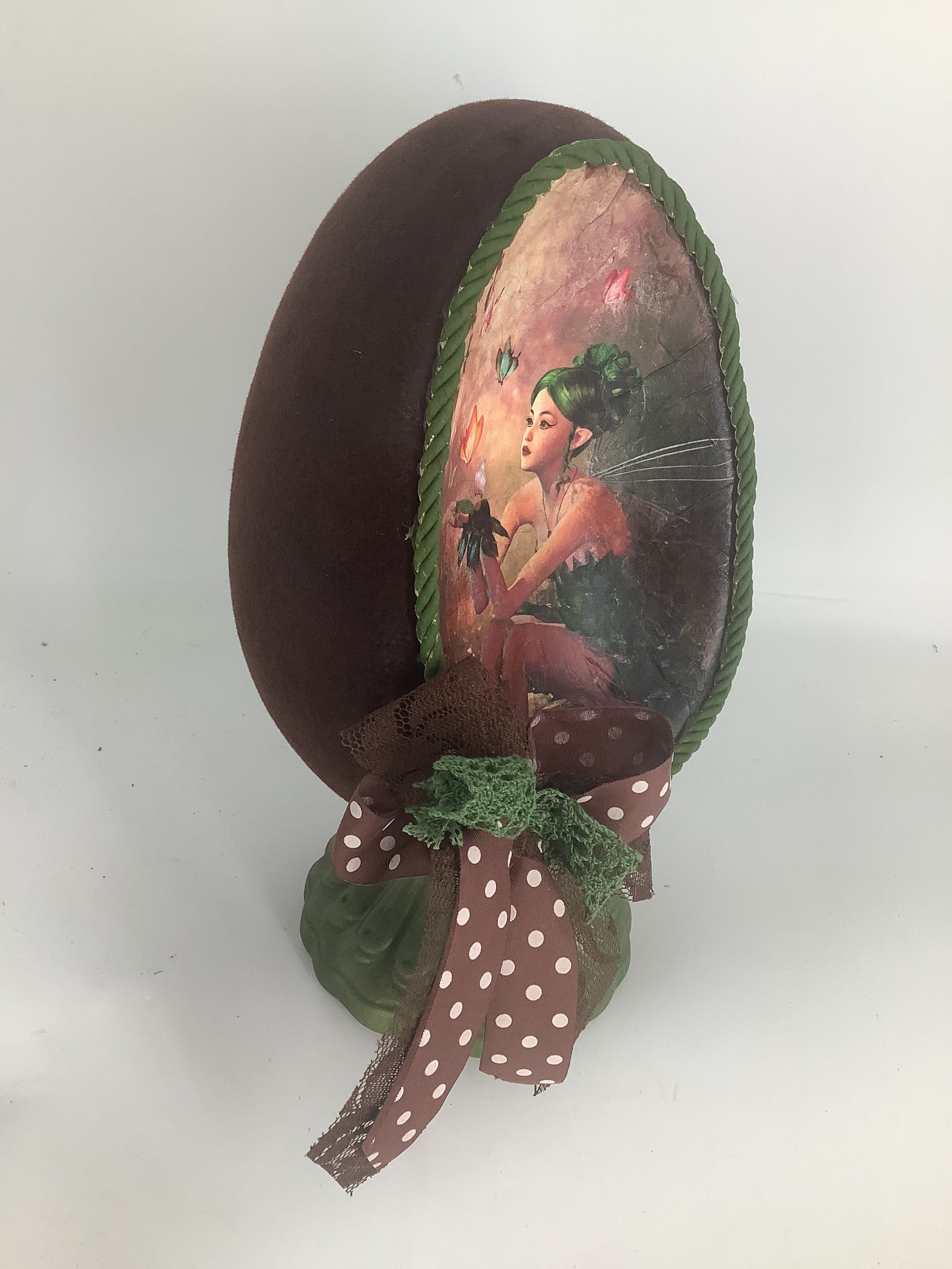 Χειροποίητο κεραμικό αυγό με νεράιδα 20cm ύψος με βάση σε αποχρώσεις του καφέ και λάδι με τεχνοτροπία βελούδο το κάνουν ξεχωριστό. Ένα μοναδικό κομμάτι για να στολίσει και το δικό σας σπίτι με πασχαλινή διάθεση.