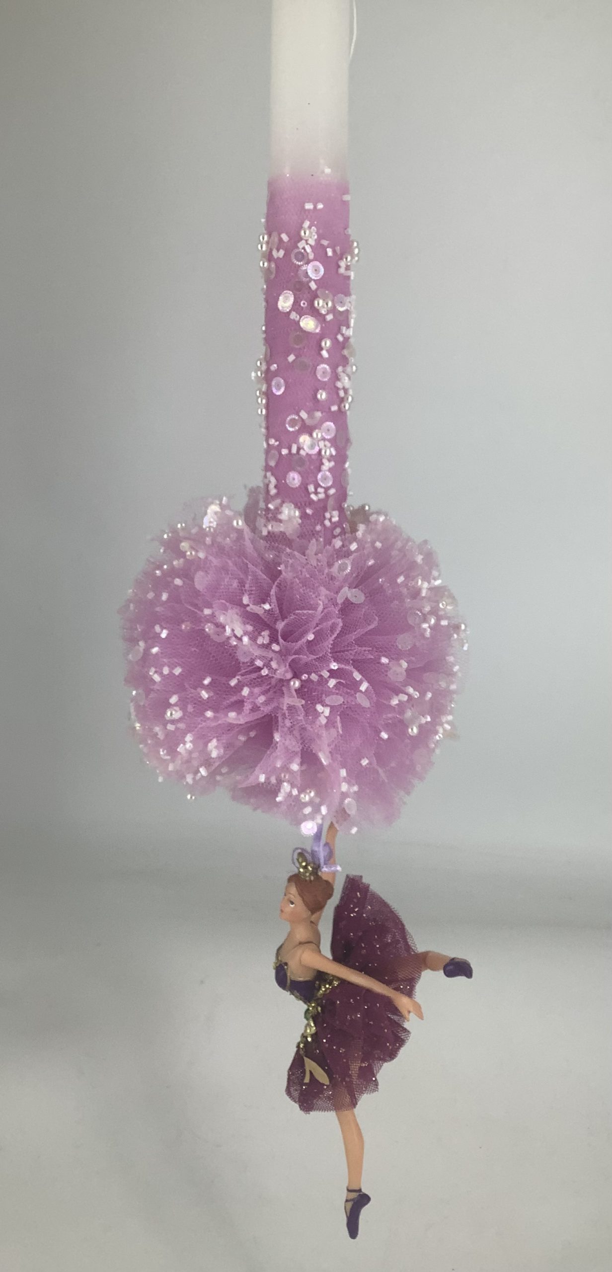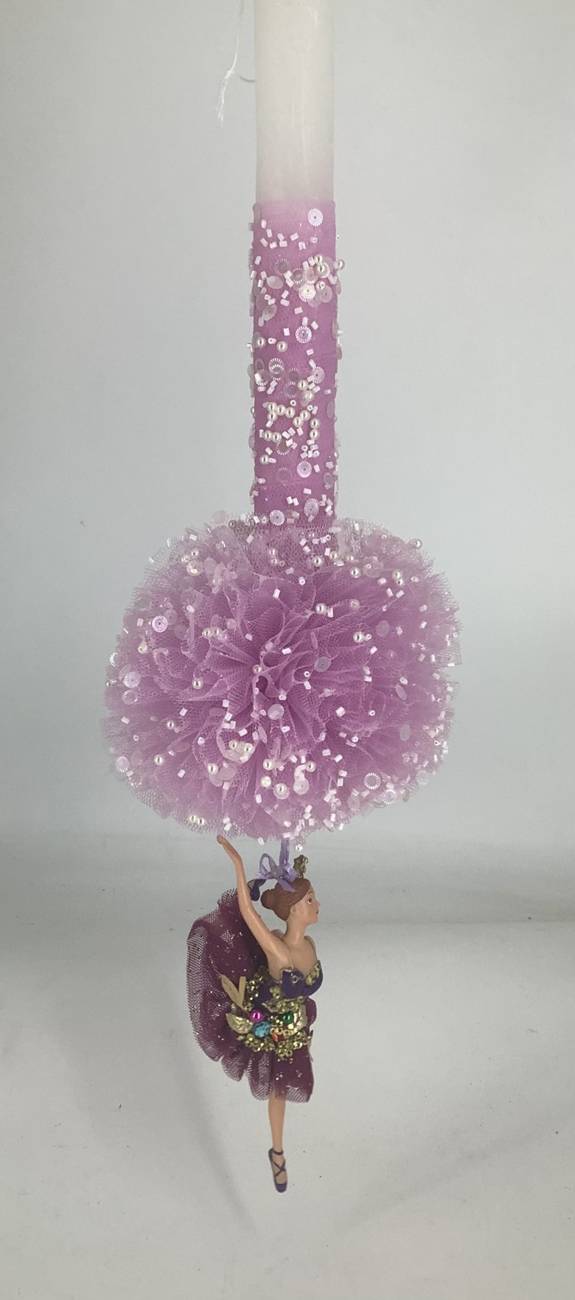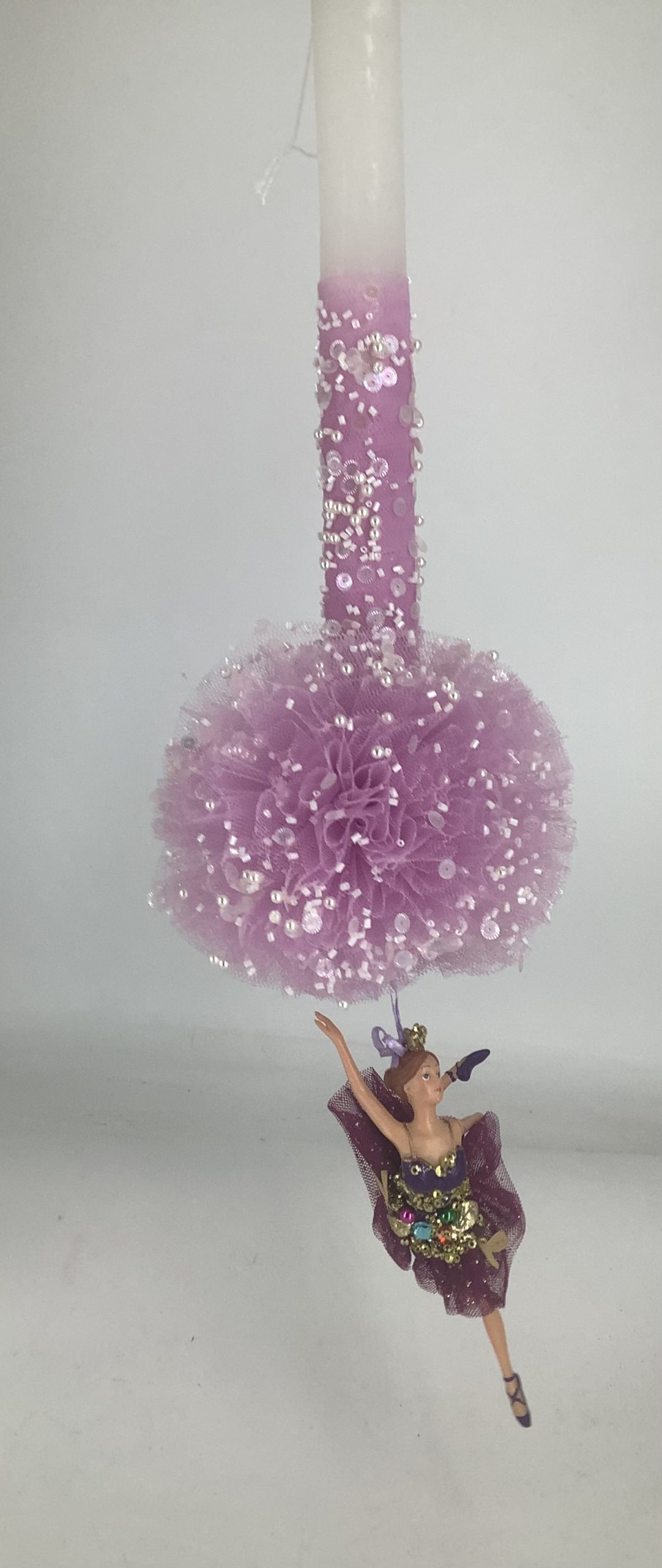 Υπέροχη λαμπάδα νεράιδα σε αποχρώσεις του μοβ για να εντυπωσιάσετε την αγαπημένη σας βαφτιστήρα. Μια εξαιρετική επιλογή που θα λατρέψουν οι νονοί και τα βαφτιστήρια