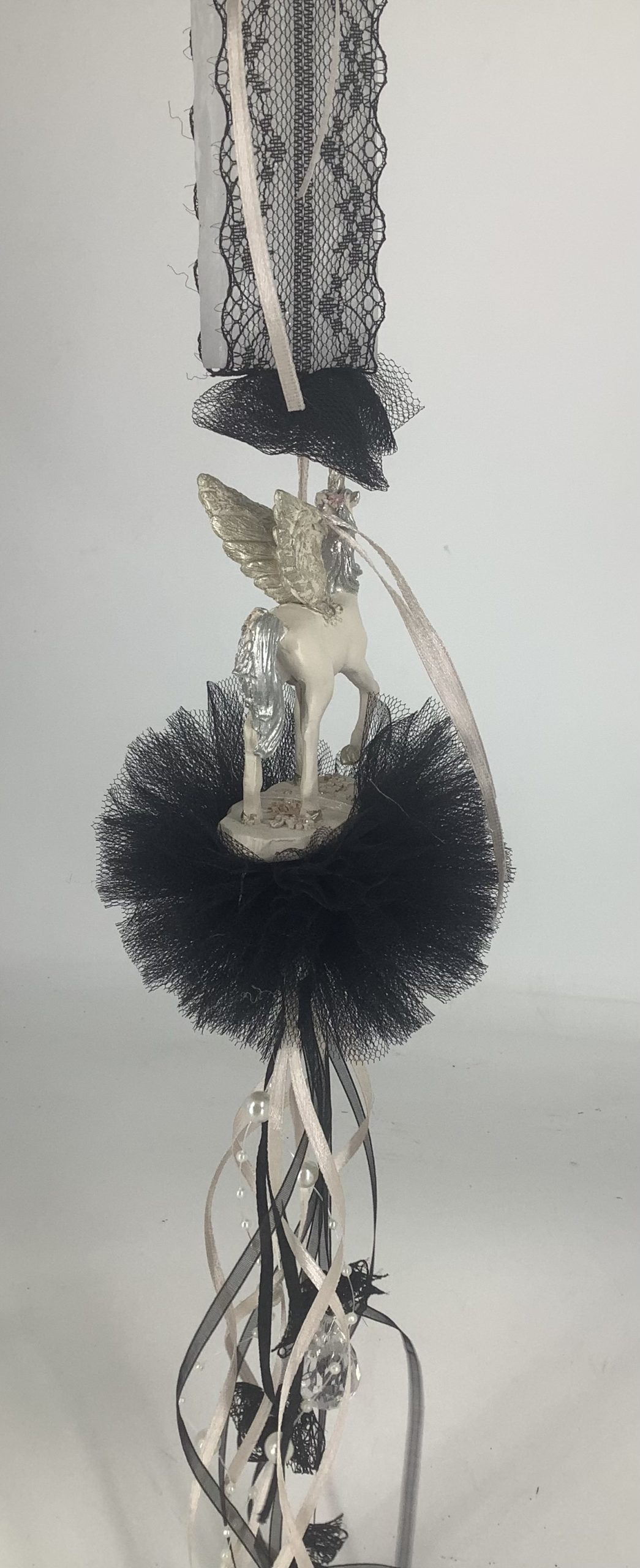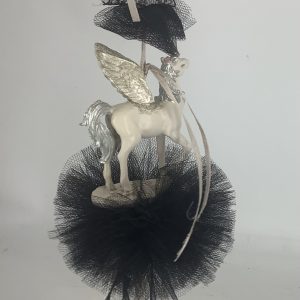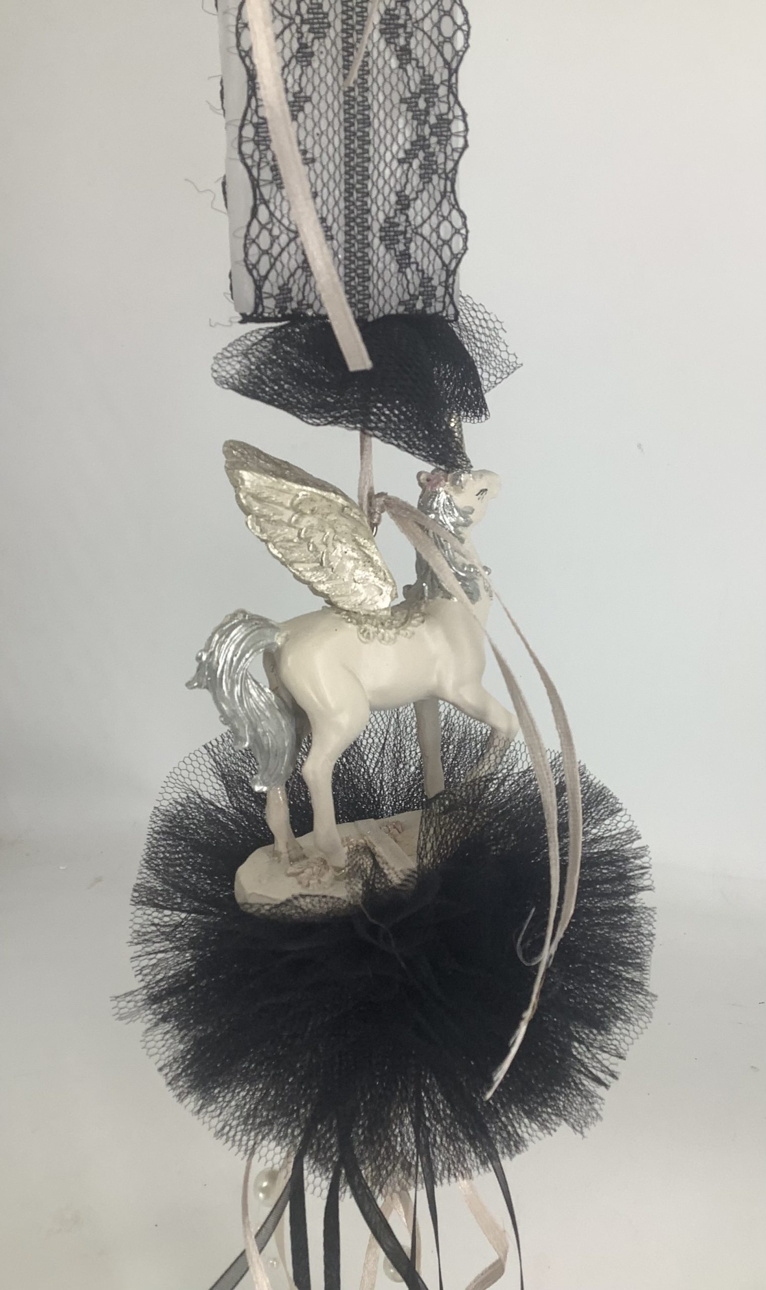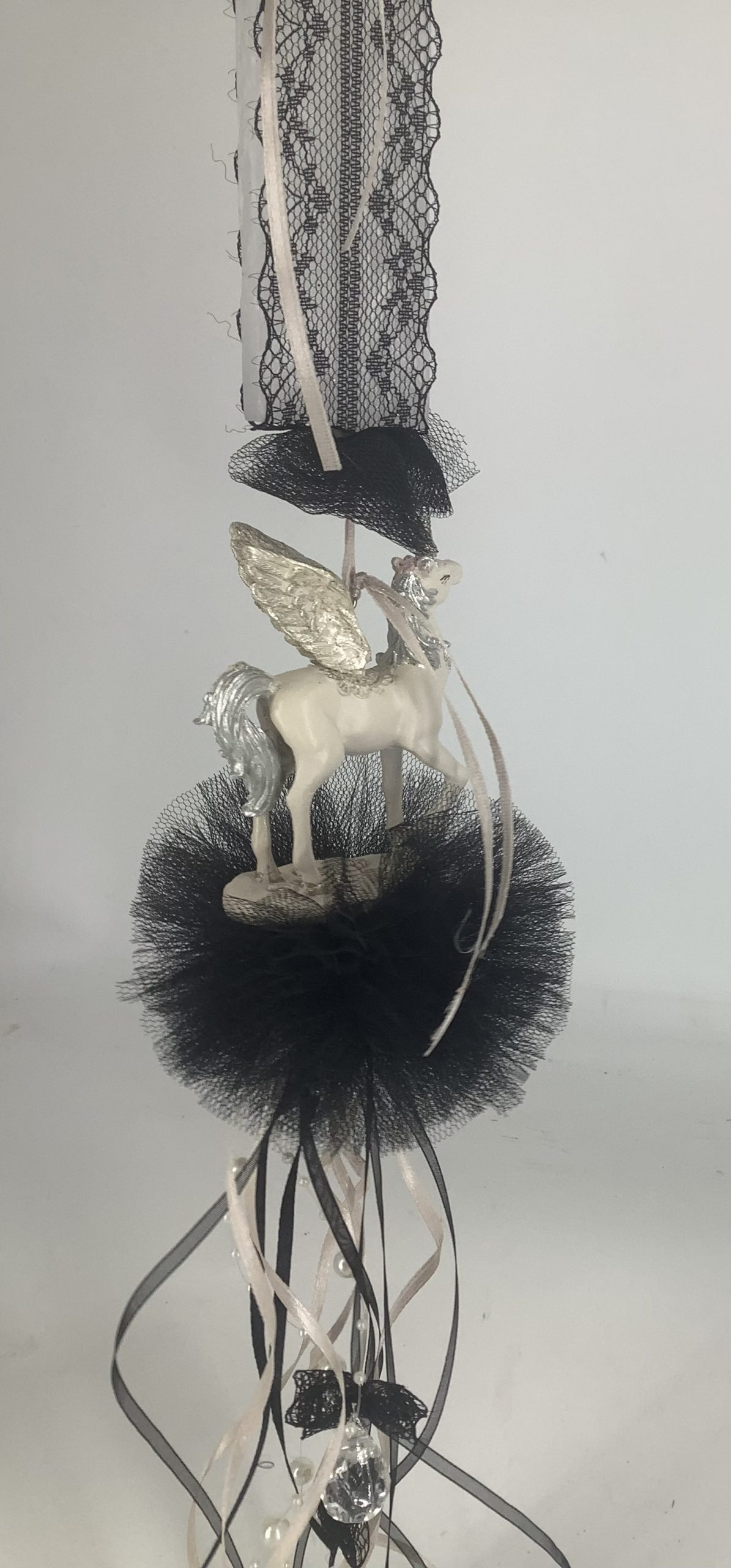 Υπέροχη λαμπάδα σε αποχρώσεις της άσπρου μαύρου με τον αγαπημένο σας Πήγασο για να εντυπωσιάσετε την αγαπημένη σας βαφτιστήρα. Μια εξαιρετική επιλογή που θα λατρέψουν οι νονοί και τα βαφτιστήρια
