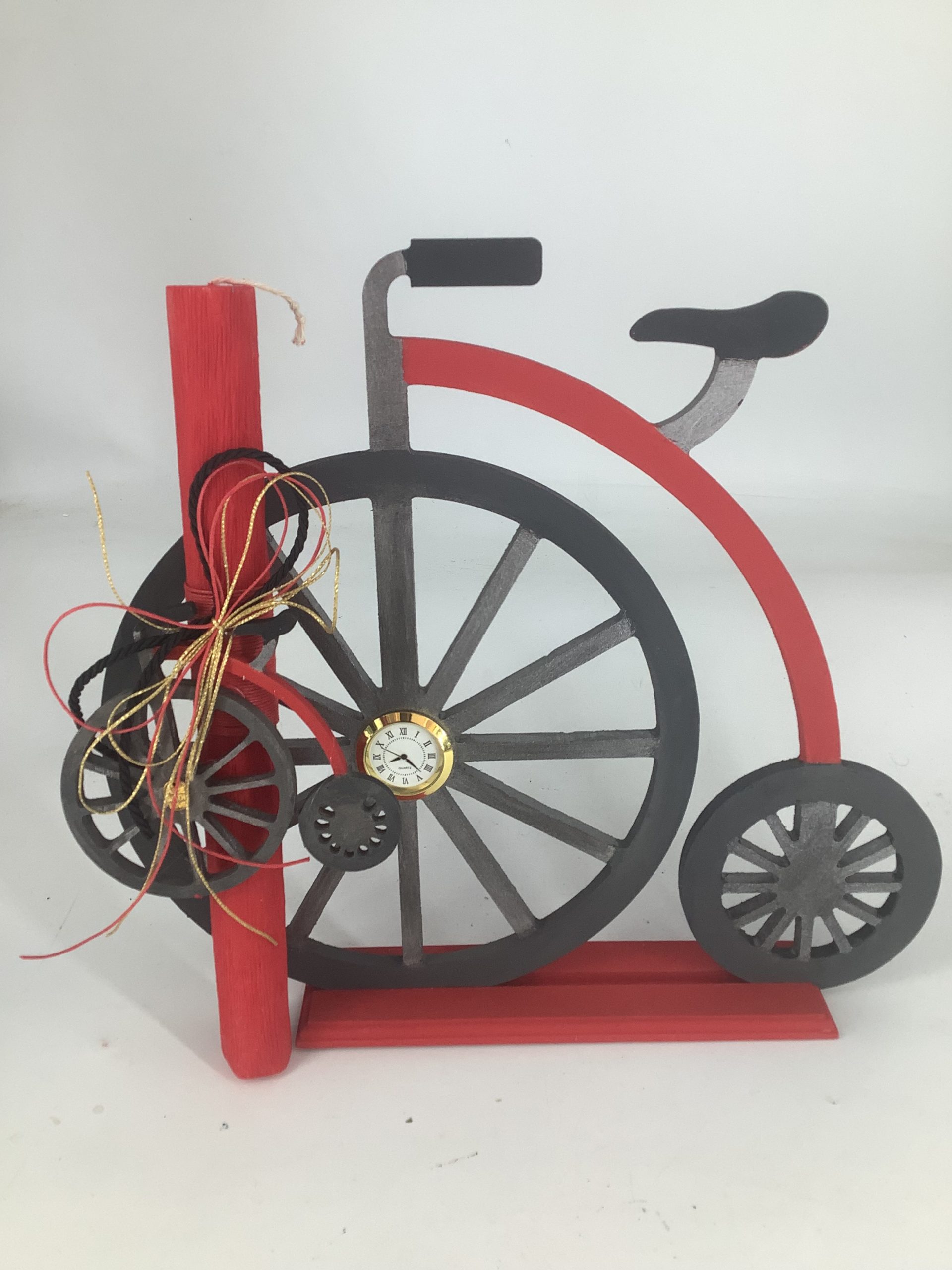 Υπέροχο μοναδικό χειροποίητο ποδήλατο με ρολόι στο κέντρο της ρόδας για να εντυπωσιάσετε μικρούς και μεγάλους με μια φανταστική χειροποίητη λαμπάδα από την νεράιδα των επιθυμιών την νεράιδα Alegrina.