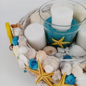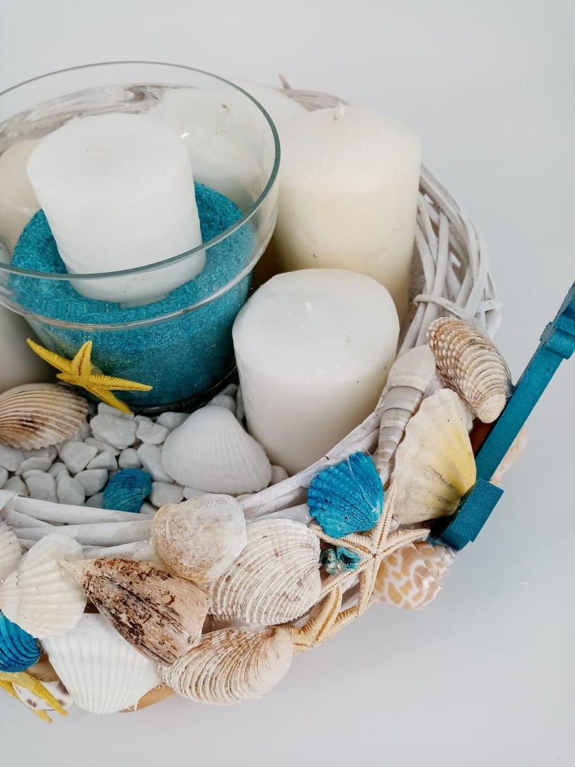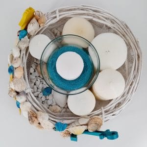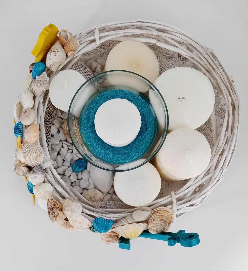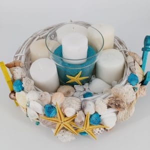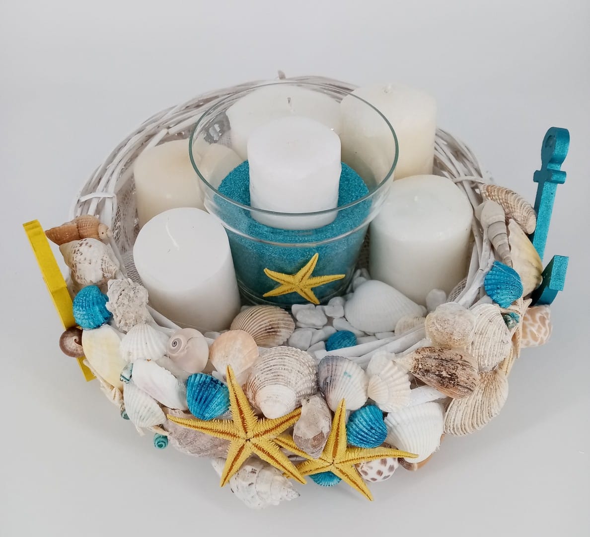 Καλοκαιρινό επιτραπέζιο στεφάνι κάνοντας το μπαλκόνι σας να μυρίσει θάλασσα. Μπαμπού βάση διαμέτρου 40cm διακοσμημένη με πραγματικά κοχύλια και αστερίες και διακοσμητικά απο ξύλο. Γυάλα στο εσωτερικό του με χρωματιστη άμμο και κερί και 5 ακόμα κεριά περιφερειακά της γυάλας που η φλόγα τους θα σας δημιουργήσει μοναδική καλοκαιρινή ατμόσφαιρα. Ένα δώρο για να πεις καλό καλοκαίρι στον δάσκαλο στην δασκάλα, στον φίλο στο αγαπημένο σου πρόσωπο.