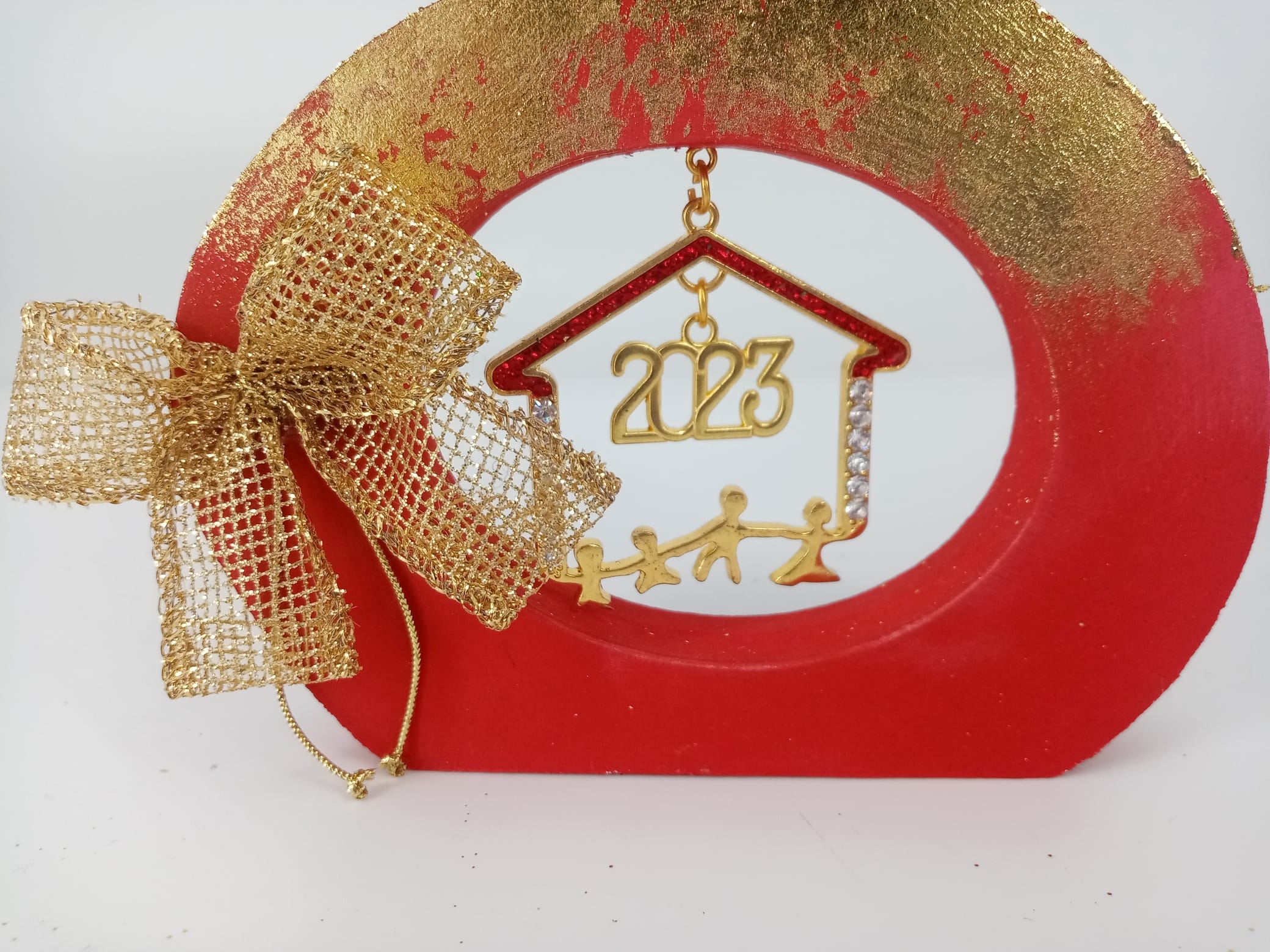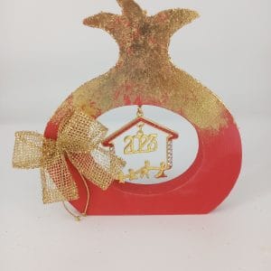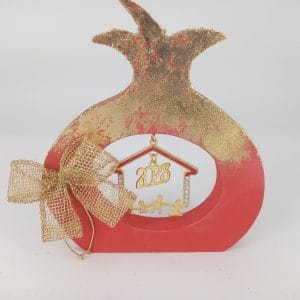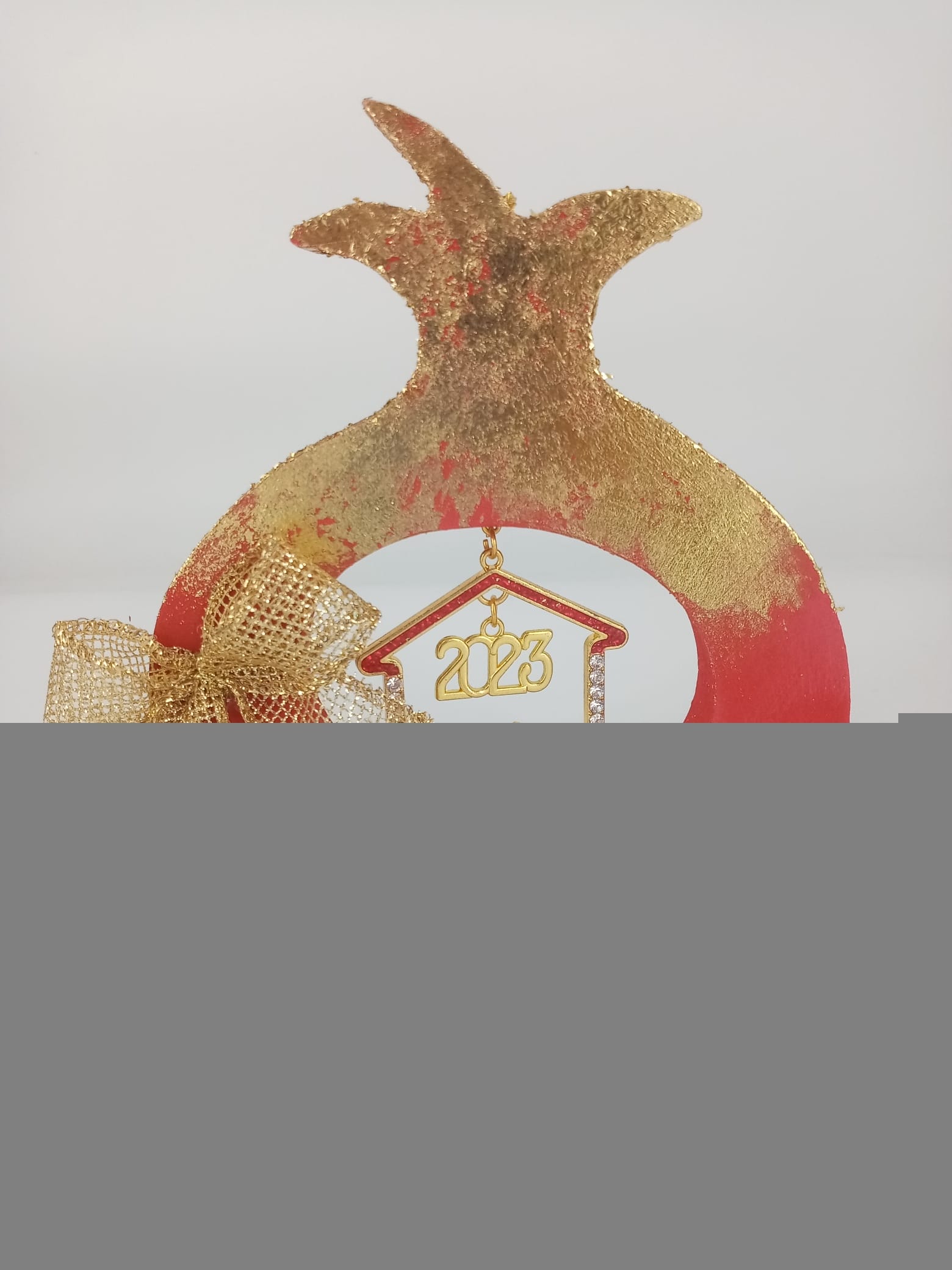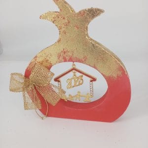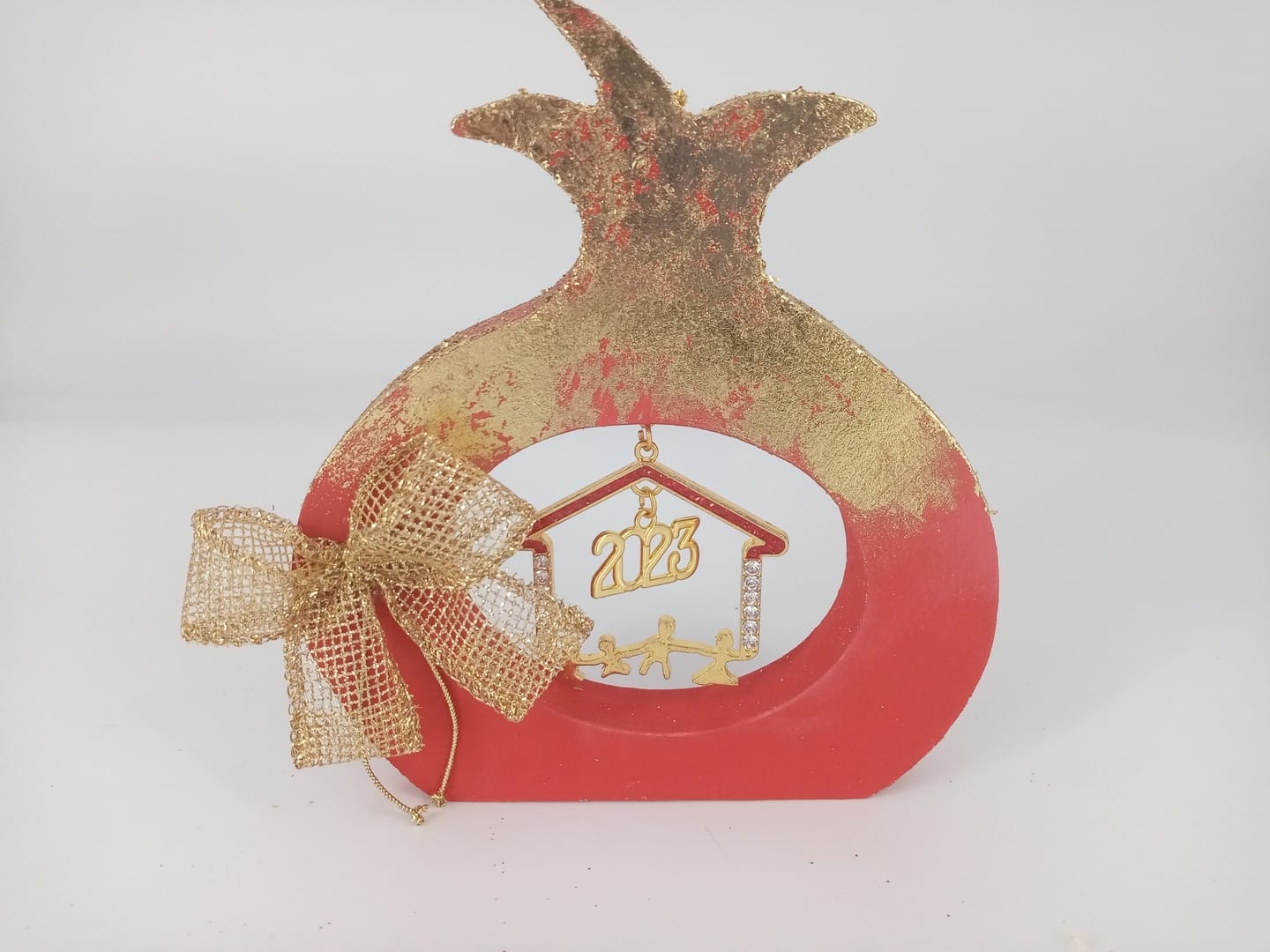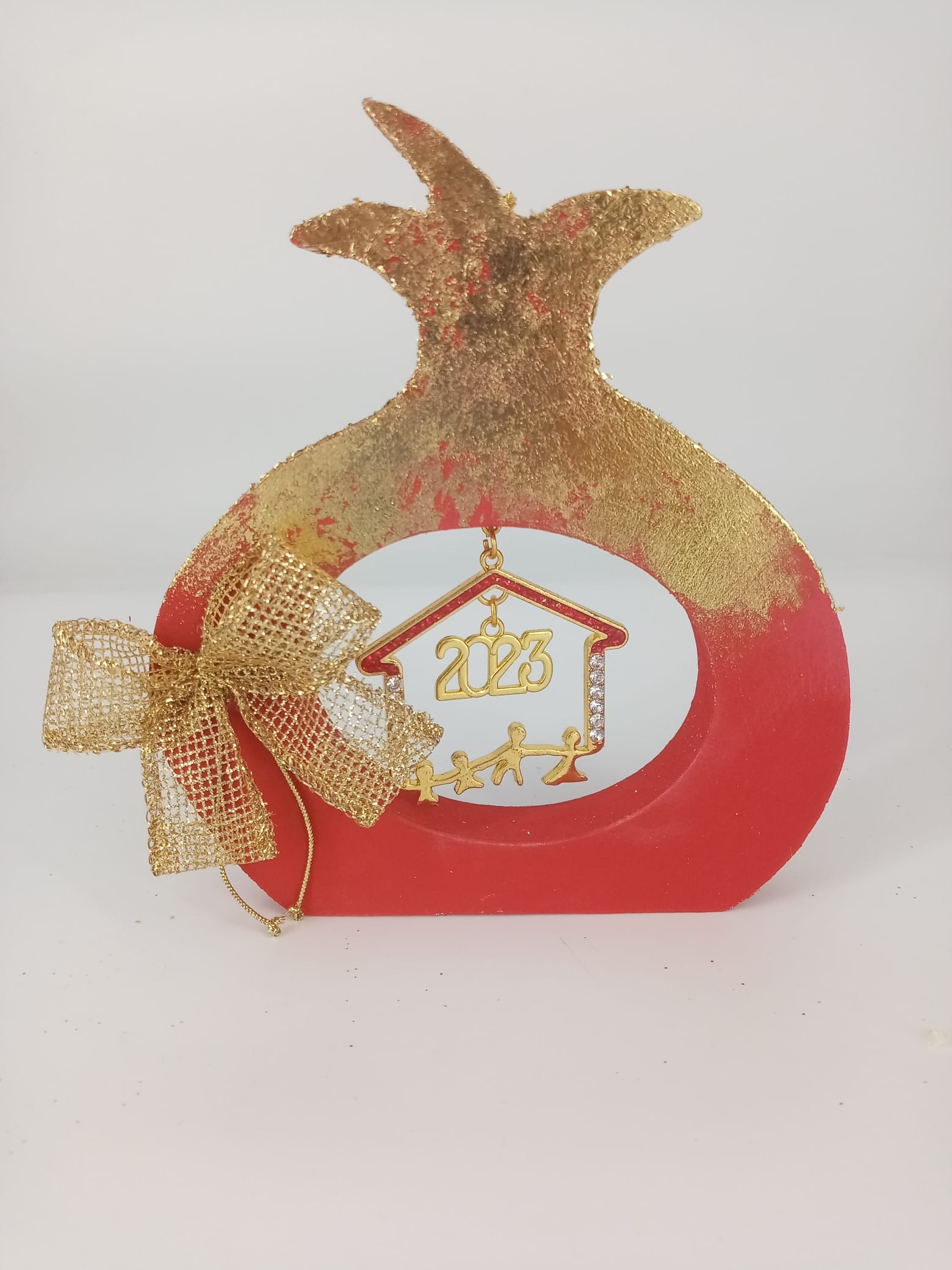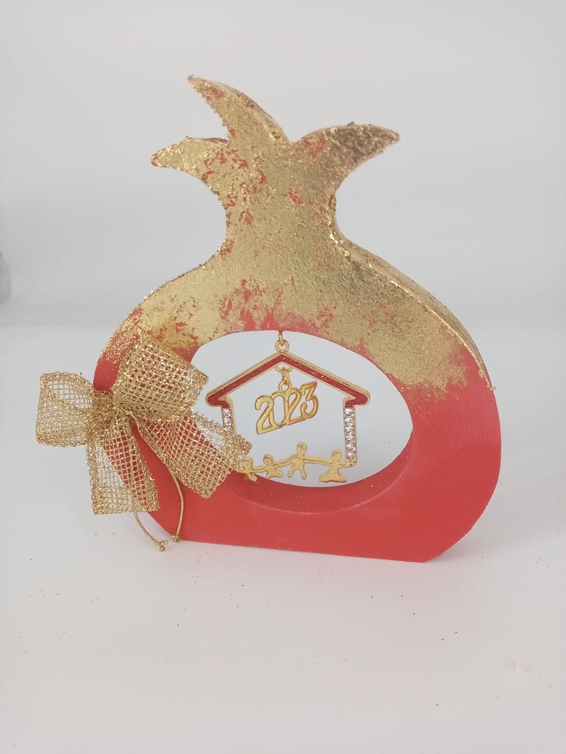 Ξύλινο υπέροχο ρόδι διακοσμημένο με φύλλα χρυσού και μεταλλικά στοιχεία.